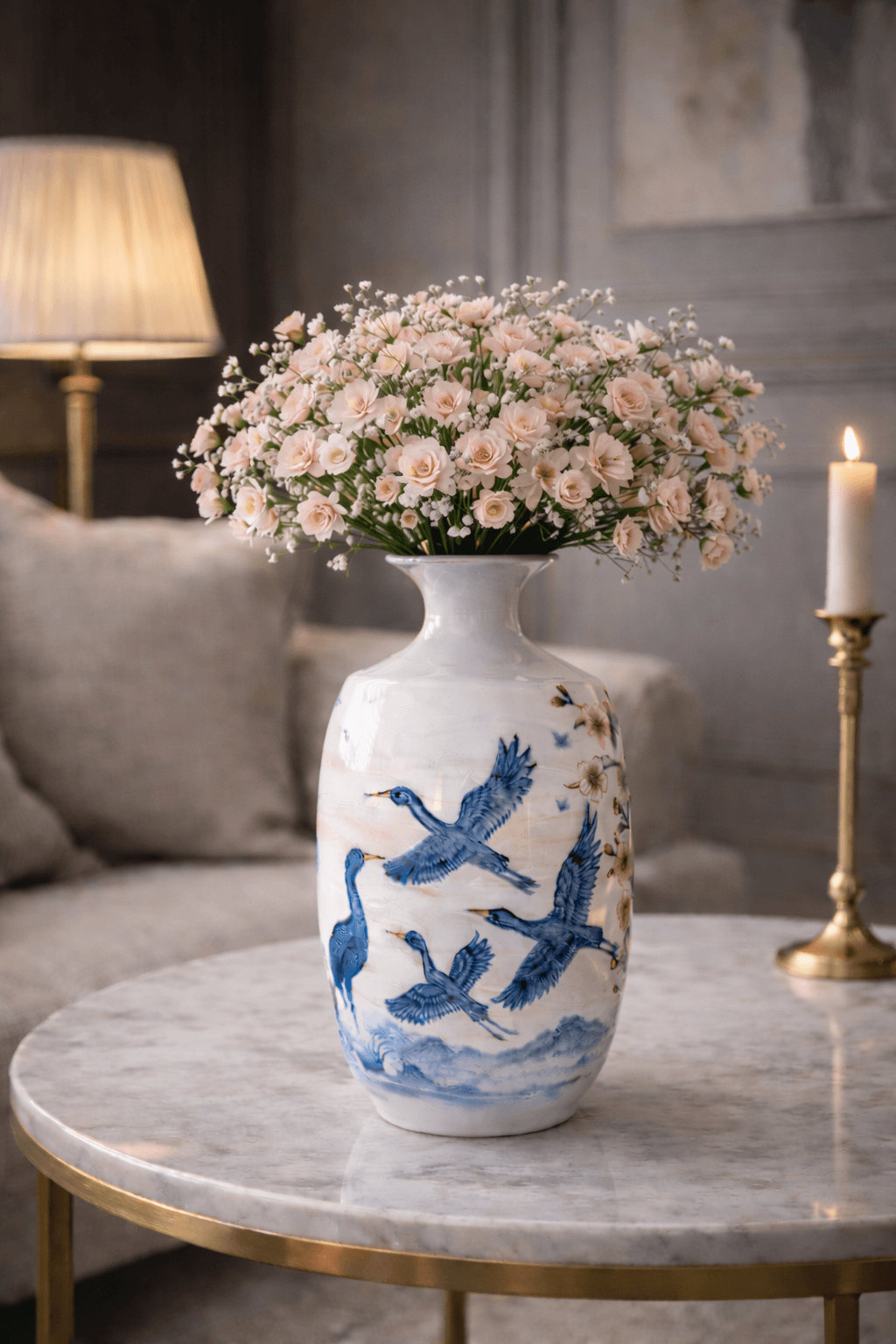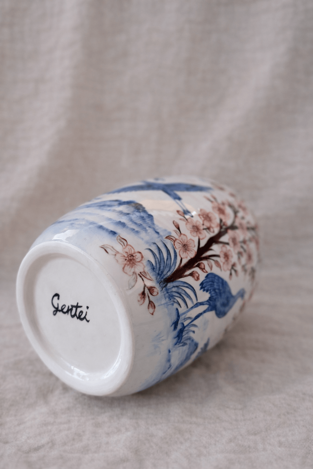Turna kuşu Japon estetiğinde uzun ömür, sadakat ve zarif bir yaşamın simgesidir. Mavi tonları ise dinginliği, bilgeligi ve gökyüzüyle kurulan sonsuz bağı temsil eder.