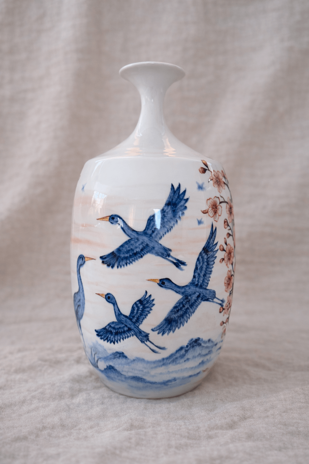 Bu özel tasarımda turnalar, dalgaların üzerinden süzülerek sakura dalları arasında zamansız bir yolculuğa çıkar. Uçuş hâlindeki figürler özgürlüğü ve içsel huzuru anlatırken, açan kiraz çiçekleri yeniden doğuşun ve umut dolu başlangıçların sembolüdür.