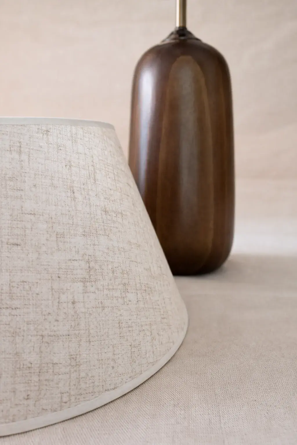 Ahşap gövdesinin yukarı doğru akıcı şekilde yükselen formu ve keten dokulu şapkası, ışığı yumuşatarak ortama dengeli ve sakin bir aydınlık yayar.