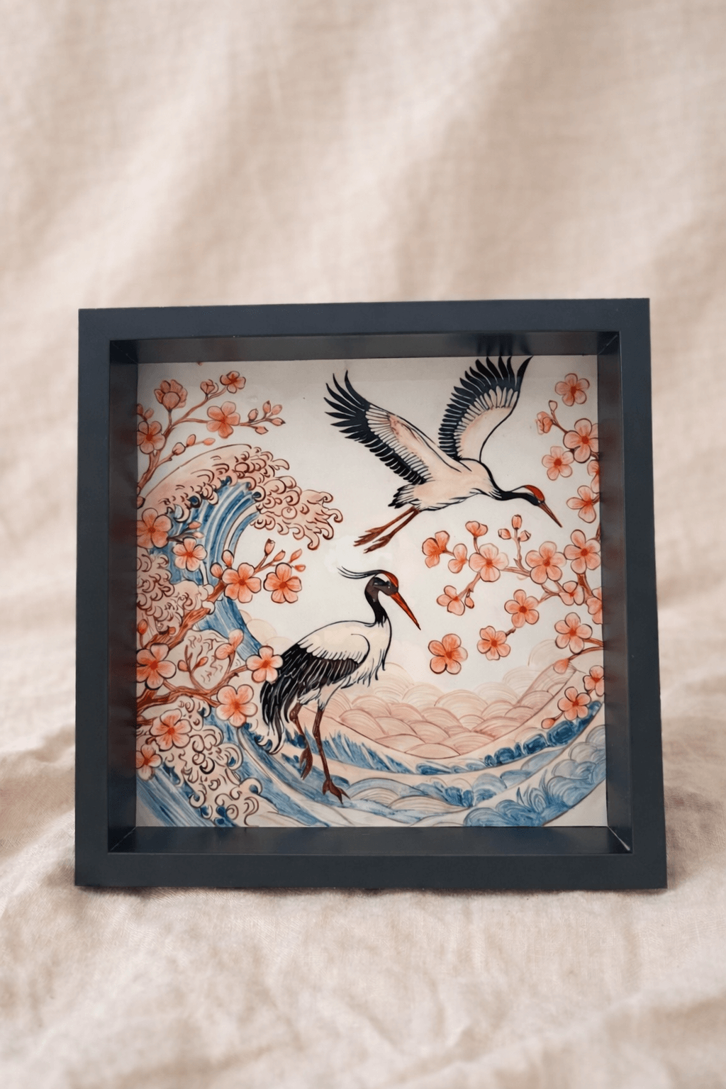“Sakunami”, adını Japonca’da sakura (kiraz çiçeği) ve nami (dalga) kelimelerinin birleşiminden alır. Bu tasarım; uzun ömür ve huzurun sembolü olan turna kuşlarını, baharın geçici ama zarif güzelliğini temsil eden sakura çiçeklerini ve yaşamın sürekli akışını simgeleyen dalgaları bir araya getirir. Bir anın dinginliği ile hareketin gücü, Sakunami’de dengeli bir kompozisyonla buluşur.